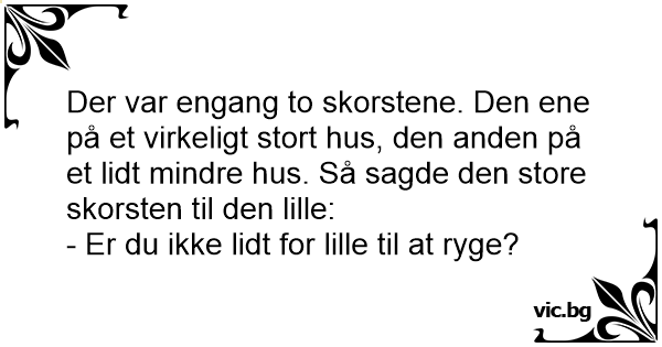 Der var engang to skorstene. Den ene på et virkeligt stort hus, den anden på et lidt mindre hus. Så sagde den store skorsten til den lille: