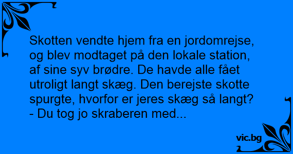 Skotten vendte hjem fra en jordomrejse, og blev modtaget på den lokale station, af sine syv brødre. De havde alle fået utroligt langt skæg. Den berejste skotte spurgte, hvorfor er jeres skæg så langt?