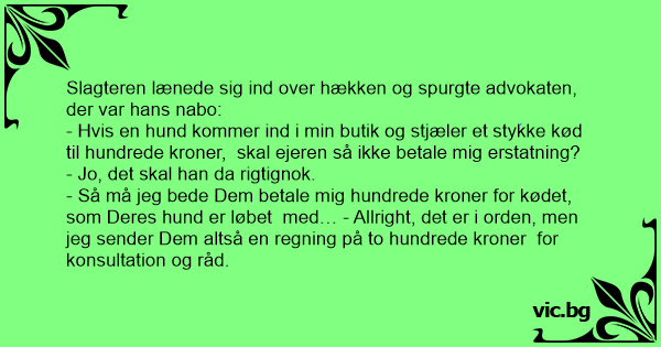 - Så må jeg bede Dem betale mig hundrede kroner for kødet, som Deres hund er løbet med… - Allright, det er i orden, men jeg sender Dem altså en regning på to hundrede kroner for konsultation og råd.