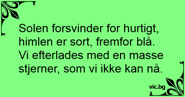 Solen forsvinder for hurtigt, himlen er sort, fremfor blå. Vi efterlades med en masse stjerner, som vi ikke kan nå.