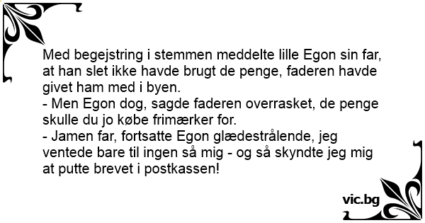 - Men Egon dog, sagde faderen overrasket, de penge skulle du jo købe frimærker for.