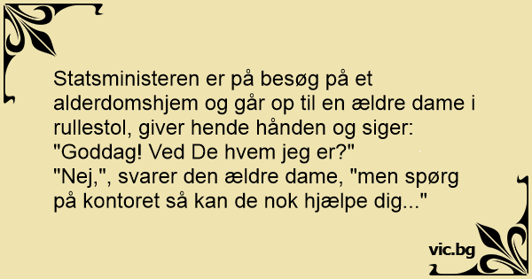 Statsministeren er på besøg på et alderdomshjem og går op til en ældre dame i rullestol, giver hende hånden og siger: