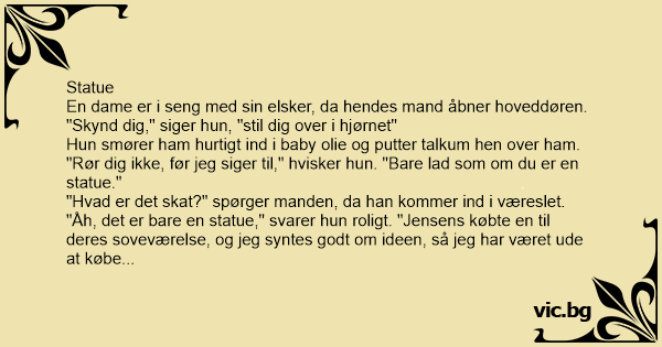 Een vrouw was in bed met haar minnaar, toen haar man plotseling thuis kwam. 'Vlug', zei ze 'ga in de hoek staan'. Ze smeerde hem snel in met babyolie en strooide grote hoeveelheden babypoeder over...