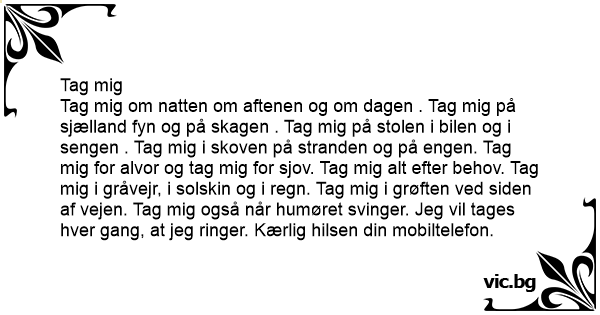 Tag mig om natten om aftenen og om dagen . Tag mig på sjælland fyn og på skagen . Tag mig på stolen i bilen og i sengen . Tag mig i skoven på stranden og på engen. Tag mig for alvor og tag mig for sjov. Tag mig alt efter behov. Tag mig i gråvejr, i solskin og i regn. Tag mig i grøften ved siden af vejen. Tag mig også når humøret svinger. Jeg vil tages hver gang, at jeg ringer. Kærlig hilsen din mobiltelefon.
