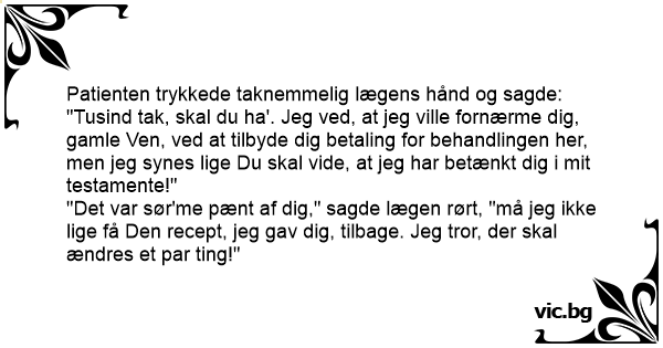 "Tusind tak, skal du ha'. Jeg ved, at jeg ville fornærme dig, gamle Ven, ved at tilbyde dig betaling for behandlingen her, men jeg synes lige Du skal vide, at jeg har betænkt dig i mit testamente!"