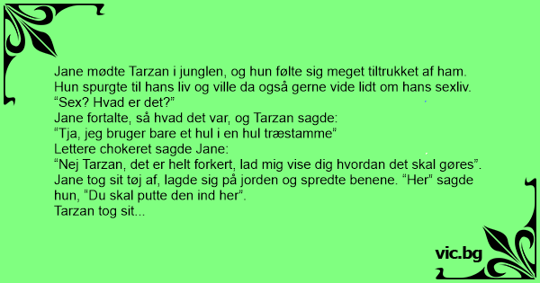 När Tarzan och Jane träffades uppstod kärlek o lust på en gång. Jane frågade Tarzan: - Hur brukar du lösa sexbiten här ute i djungeln? - Tarzan vet inte sex, svarade han. Jane förklarade o Tarzan...
