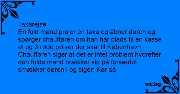 En fuld mand prajer en taxa og åbner døren og spørger chaufføren om han har plads til en kasse øl og 3 røde pølser der skal til København.