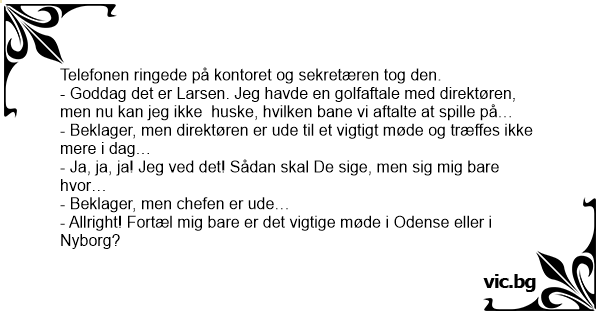 - Goddag det er Larsen. Jeg havde en golfaftale med direktøren, men nu kan jeg ikke huske, hvilken bane vi aftalte at spille på…