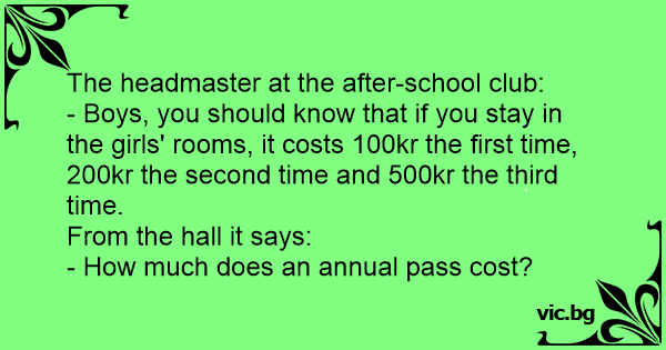 Директорът на спортното училище: - Момчета, трябва да знаете, че ако останете в стаите на момичетата, това струва 100 евро първия път, 200 евро втория път и 500 евро третия път. От коридора се...