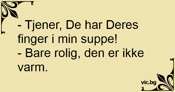 - Tjener, hvorfor har De fingeren nede i min suppe? - Jeg har stødt den, og det lindrer så dejligt, når jeg har den i noget varmt. - Hvorfor fanden stopper De den så ikke op i røven? - Det gør jeg...