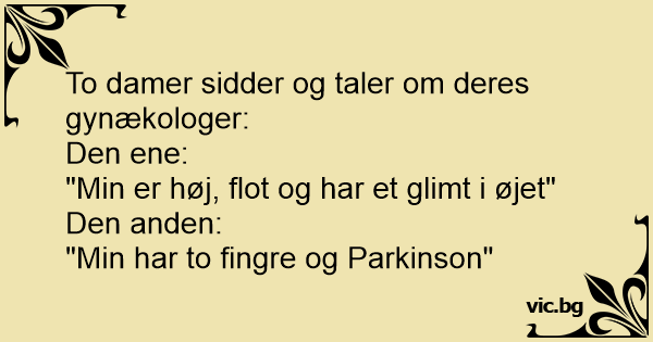 Bedste gynækolog To damer pralede med, hvem der havde den bedste gynækolog. “Min er ung, flot og har glimt i øjet” Sagde den ene. Den anden: “Min har tykke fingre og har Parkinson”