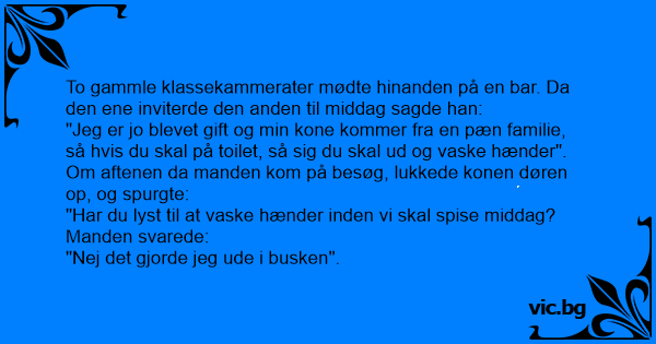 To gammle klassekammerater mødte hinanden på en bar. Da den ene inviterde den anden til middag sagde han: