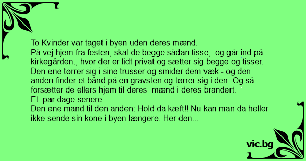 Den ene mand til den anden: Hold da kæft!! Nu kan man da heller ikke sende sin kone i byen længere. Her den anden dag kom hun hjem uden trusser!!!
