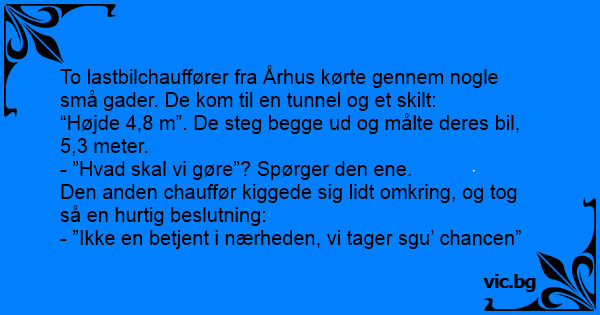 To lastbilchauffører fra Århus kørte gennem nogle små gader. De kom til en tunnel og et skilt: