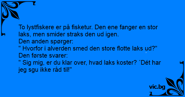 Kaksi miestä oli kalassa. Toinen sai jättisuuren lohen, mutta heitti sen takaisin mereen. - Miksi teit noin? ihmetteli toinen. - Ei minulla ole varaa syödä lohta