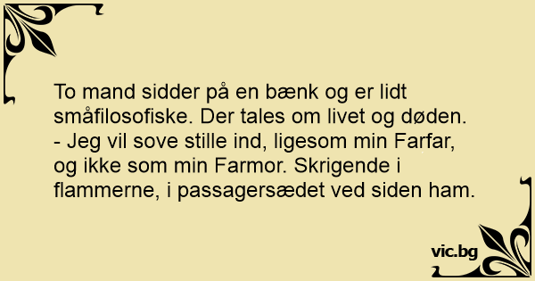 - Jeg vil sove stille ind, ligesom min Farfar, og ikke som min Farmor. Skrigende i flammerne, i passagersædet ved siden ham.