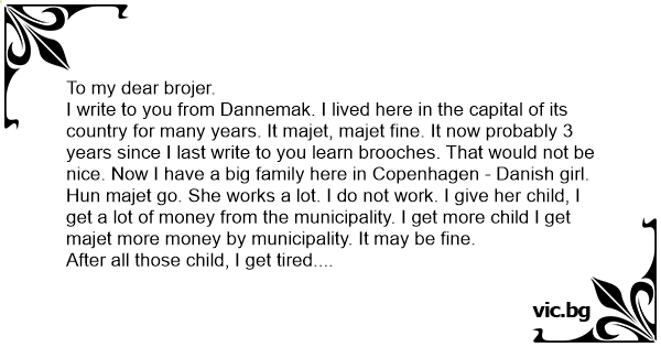I write to you from Dannemak. I lived here in the capital of its country for many years. It majet, majet fine. It now probably 3 years since I last write to you learn brooches. That would not be nice. Now I have a big family here in Copenhagen - Danish girl. Нun majet go. She works a lot. I do not work. I give her child, I get a lot of money from the municipality. I get more child I get majet more money by municipality. It may be fine.