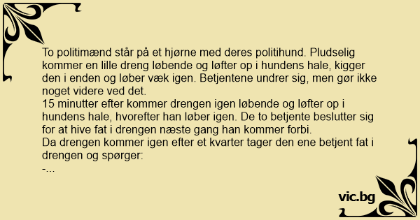 15 minutter efter kommer drengen igen løbende og løfter op i hundens hale, hvorefter han løber igen. De to betjente beslutter sig for at hive fат i drengen næste gang han kommer forbi.