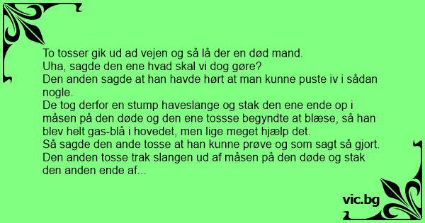 De tog derfor en stump haveslange og stak den ene ende op i måsen på den døde og den ene tossse begyndte at blæse, så han blev helt gas-blå i hovedet, men lige meget hjælp det.