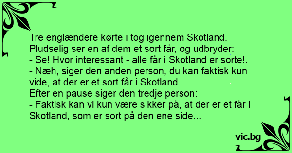 Tre englændere kørte i tog igennem Skotland. Pludselig ser en af dem et sort får, og udbryder: