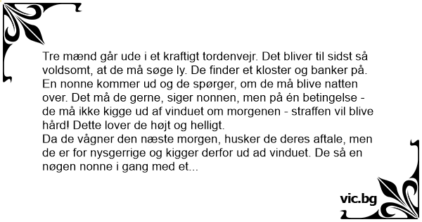 Tre mænd går ude i et kraftigt tordenvejr. Det bliver til sidst så voldsomt, at de må søge ly. De finder et kloster og banker på. En nonne kommer ud og de spørger, om de må blive natten over. Det må de gerne, siger nonnen, men på én betingelse - de må ikke kigge ud af vinduet om morgenen - straffen vil blive hård! Dette lover de højt og helligt.