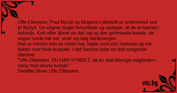 Uffe Ellemann, Poul Nyrup og Mogens Lykketoft er omkommet ved et flystyrt. De vågner noget fortumlede og opdager, at de er havnet i helvede. Kort efter åbner en dør sig og den grimmeste kvinde, de nogen sinde har set, viser sig bag døråbningen. Hun er mindre end en meter høj, lugter som ind i helvede og har bylder over hele kroppen. I det samme lyder en dyb rungende stemme: "Uffe Ellemann, DU HAR SYNDET, så du skal tilbringe evigheden i seng med denne kvinde." Derefter bliver Uffe Ellemann ført ind til kvinden af djævlens håndlangere og døren bliver lukket og låst. Poul Nyrup og Mogens Lykketoft står chokerede tilbage. Kort efter åbner endnu en dør sig, og en endnu grimmere kvinde kommer til syne. Hun er over 2 meter høj, tromlefed og omsværmet af fluer og andet kravl. I det samme lyder en dyb rungende stemme: "Poul Nyrup, DU HAR SYNDET, så du skal tilbringe evigheden i seng med denne kvinde." Poul Nyrup bliver ført ind til kvinden af djævlens håndlangere og døren lukket og Mogens Lykketoft står chokeret og alene tilbage. Lidt efter åbner en tredie dør sig, og en kvinde, der ligner Tina Kjær umiskendeligt meget kommer til syne. Mogens Lykketoft liver op, og er så småt på vej til at gå hende i møde, da en buldrende stemme lyder: "Tina Kjær, DU HAR SYNDET..."