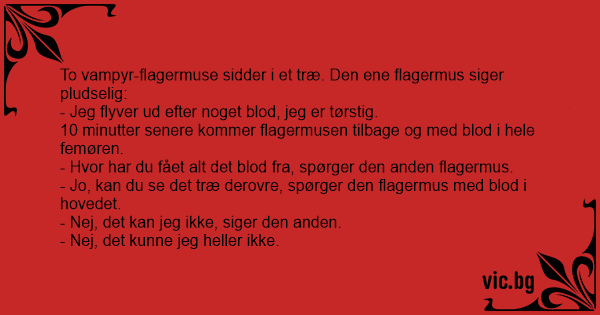 To vampyr-flagermuse sidder i et træ. Den ene flagermus siger pludselig:
