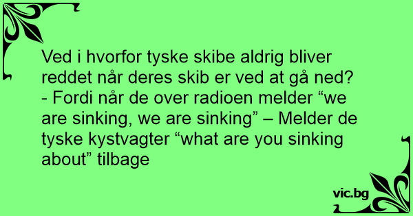 - Fordi når de over radioen melder “we are sinking, we are sinking” – Melder de tyske kystvagter “what are you sinking about” tilbage