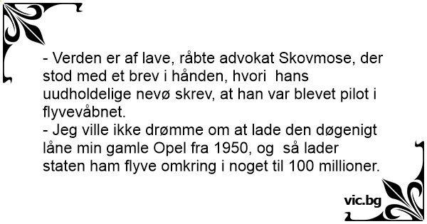 - Verden er af lave, råbte advokat Skovmose, der stod med et brev i hånden, hvori hans uudholdelige nevø skrev, at han var blevet pilot i flyvevåbnet.
