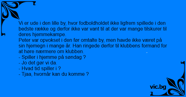 Peter var opvokset i den før omtalte by, men havde ikke været på sin hjemegn i mange år. Han ringede derfor til klubbens formand for at høre nærmere om klubben.