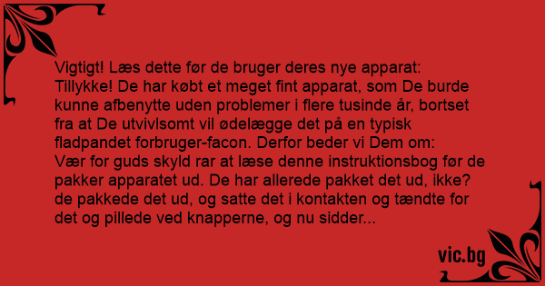 Vær for guds skyld rar at læse denne instruktionsbog før de pakker apparatet ud. De har allerede pakket det ud, ikke? de pakkede det ud, og satte det i kontakten og tændte for det og pillede ved knapperne, og nu sidder deres