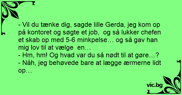 - Vil du tænke dig, sagde lille Gerda, jeg kom op på kontoret og søgte et job, og så lukker chefen et skab op med 5-6 minkpelse… og så gav han mig lov til at vælge en…