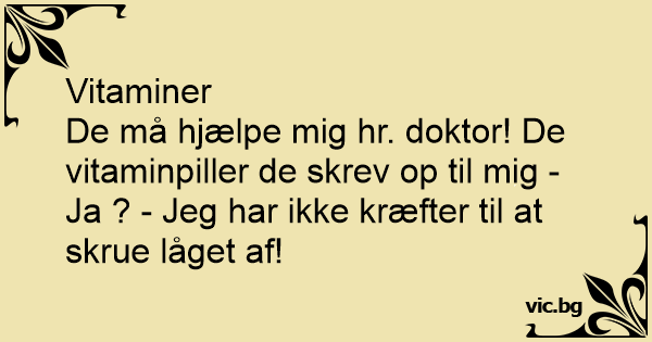 De må hjælpe mig hr. doktor! De vitaminpiller de skrev op til mig - Ja ? - Jeg har ikke kræfter til at skrue låget af!