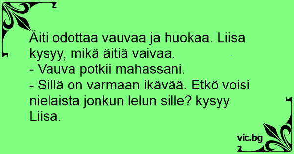 Äiti odottaa vauvaa ja huokaa. Liisa kysyy, mikä äitiä vaivaa.