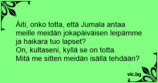 Äiti, onko totta, että Jumala antaa meille meidän jokapäiväisen leipämme ja haikara tuo lapset?