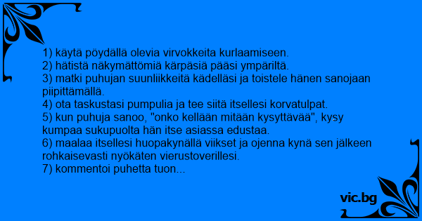 9) tartu vierustoveria poydän alla kädestä ja kuiskaa, etta sinä tunnet samaa kuin hänkin.