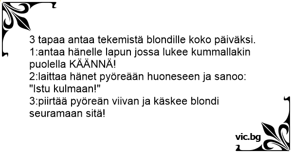 3 tapaa antaa tekemistä blondille koko päiväksi.<br />1:antaa hänelle lapun jossa lukee kummallakin puolella KÄÄNNÄ!<br />2:laittaa hänet pyöreään huoneseen ja sanoo:<br />"Istu kulmaan!"<br />3:piirtää pyöreän viivan ja käskee blondi seuramaan sitä!