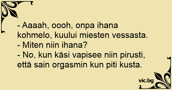 - Aaaah, oooh, onpa ihana kohmelo, kuului miesten vessasta.