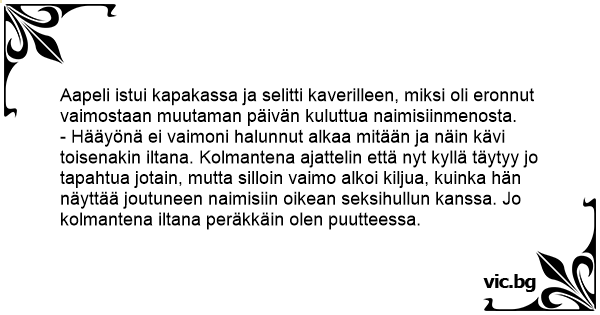 Aapeli istui kapakassa ja selitti kaverilleen, miksi oli eronnut vaimostaan muutaman päivän kuluttua naimisiinmenosta.