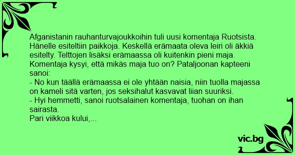 Komentaja meni silloin majaan ja siellähän olikin oikein sievä kameli. Vieressä oli jakkarakin sopivasti. Komentaja ajatteli, että ei voi mitään, asetteli jakkaran kamelin taakse ja ryhtyi hommiin. Silloin kapteeni tuli sisään majaan ja sanoi: