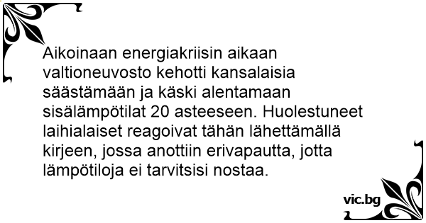Aikoinaan energiakriisin aikaan valtioneuvosto kehotti kansalaisia säästämään ja käski alentamaan sisälämpötilat 20 asteeseen. Huolestuneet laihialaiset reagoivat tähän lähettämällä kirjeen, jossa anottiin erivapautta, jotta lämpötiloja ei tarvitsisi nostaa.