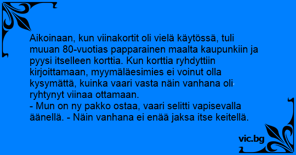 Aikoinaan, kun viinakortit oli vielä käytössä, tuli muuan 80-vuotias papparainen maalta kaupunkiin ja pyysi itselleen korttia. Kun korttia ryhdyttiin kirjoittamaan, myymäläesimies ei voinut olla kysymättä, kuinka vaari vasta näin vanhana oli ryhtynyt viinaa ottamaan.
