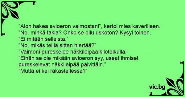 ”Aion hakea avioeron vaimostani”, kertoi mies kaverilleen.