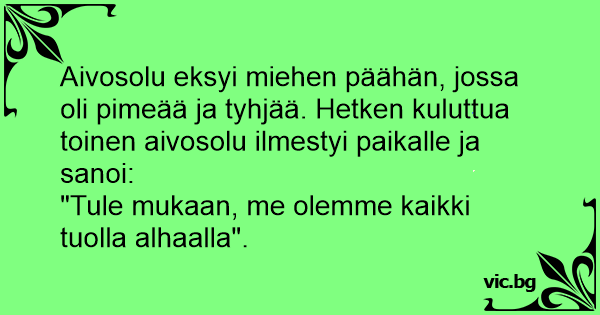 Aivosolu eksyi miehen päähän, jossa oli pimeää ja tyhjää. Hetken kuluttua toinen aivosolu ilmestyi paikalle ja sanoi:
