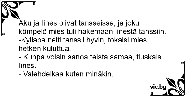 Aku ja Iines olivat tansseissa, ja joku kömpelö mies tuli hakemaan Iinestä tanssiin. -Kylläpä neiti tanssii hyvin, tokaisi mies hetken kuluttua.