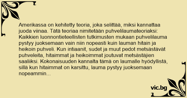 Amerikassa on kehitetty teoria, joka selittää, miksi kannattaa juoda viinaa. Tätä teoriaa nimitetään puhvelilaumateoriaksi: Kaikkien luonnontieteellisten tutkimusten mukaan puhvelilauma pystyy juoksemaan vain niin nopeasti kuin lauman hitain ja heikoin puhveli. Kun intiaanit, sudet ja muut pedot metsästävät puhveleita, hitaimmat ja heikoimmat joutuvat metsästäjien saaliiksi. Kokonaisuuden kannalta tämä on laumalle hyödyllistä, sillä kun hitaimmat on karsittu, lauma pystyy juoksemaan nopeammin kuin aikaisemmin. Kaikkien tutkimusten mukaan viina tappaa aivosoluja. Viinaa juotaessa hitaat ja huonot aivosolut kuolevat ensin. Nopeat ja suorituskykyiset aivosolut jäävät jäljelle ja aivot pystyvät parempiin suorituksiin kuin ennen juopottelua. Uskon vakaasti puhvelilaumateoriaan. Ainoa ihmetystäni herättänyt seikka on, etten vielä ole saavuttanut Einsteinin tasoa, jolla minun laskelmieni mukaan nykyään pitäisi olla.