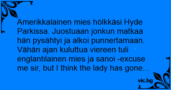 Amerikkalainen mies hölkkäsi Hyde Parkissa. Juostuaan jonkun matkaa hän pysähtyi ja alkoi punnertamaan. Vähän ajan kuluttua viereen tuli englantilainen mies ja sanoi -excuse me sir, but I think the lady has gone...
