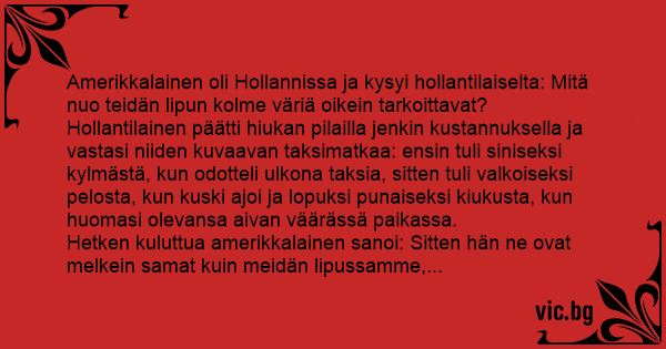 Hollantilainen päätti hiukan pilailla jenkin kustannuksella ja vastasi niiden kuvaavan taksimatkaa: ensin tuli siniseksi kylmästä, kun odotteli ulkona taksia, sitten tuli valkoiseksi pelosta, kun kuski ajoi ja lopuksi punaiseksi kiukusta, kun huomasi olevansa aivan väärässä paikassa.