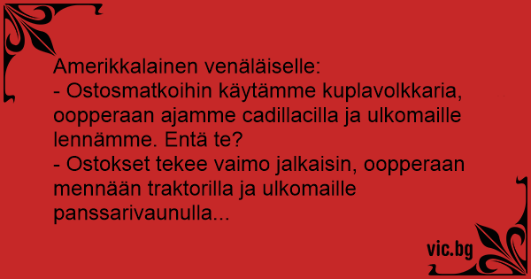 - Ostokset tekee vaimo jalkaisin, oopperaan mennään traktorilla ja ulkomaille panssarivaunulla...