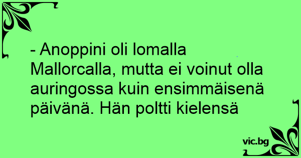 - Anoppini oli lomalla Mallorcalla, mutta ei voinut olla auringossa kuin ensimmäisenä päivänä. Hän poltti kielensä